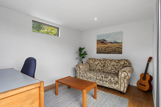 Outside, the property continues to impress with established fruit trees including feijoas, lemons, limes, and boysenberries, along with well-set-up vegetable gardens for those who enjoy growing their own produce. A separate, high-spec office or sleepout sits privately at the rear of the section, surrounded by native plantings that attract tui and other birdlife. This versatile space is perfect for working from home, accommodating guests, or providing a teenage retreat.
