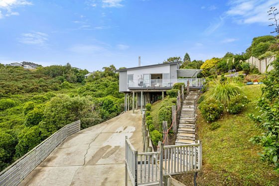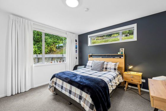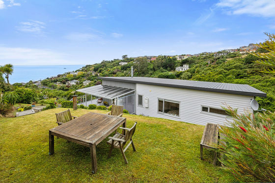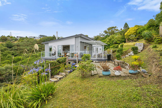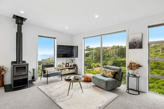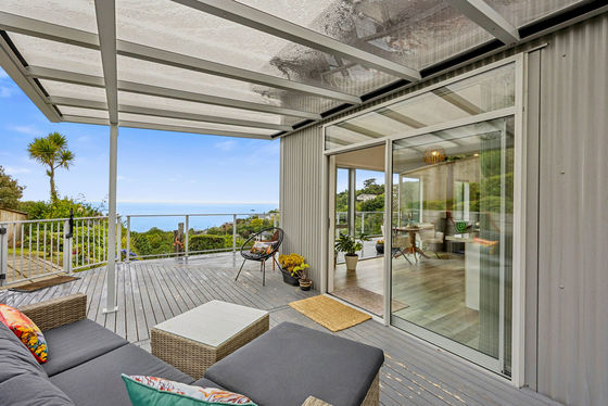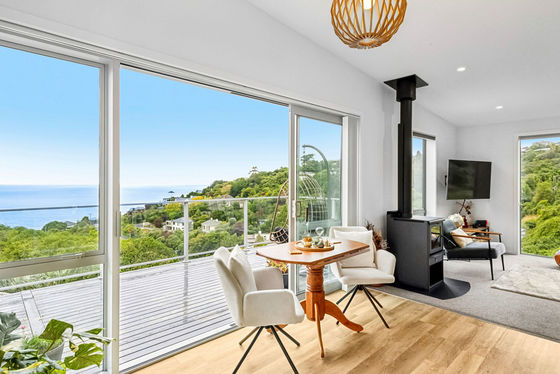 The open-plan lounge, dining and kitchen area flows seamlessly to a generous, family-sized deck via large sliding doors, where uninterrupted sea views take centre stage. An archgola enhances this outdoor space, providing sheltered, year-round enjoyment, perfect for entertaining guests or relaxing outdoors in any season.