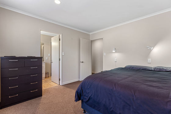A functional kitchen with breakfast bar flows seamlessly into the spacious north-facing open-plan living area, where large windows allow plenty of natural light and warmth to fill the space. A heat pump ensures year-round comfort.