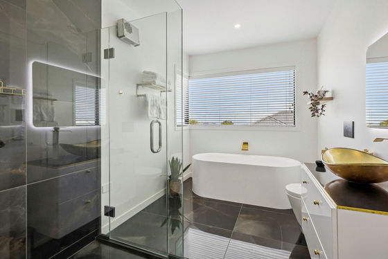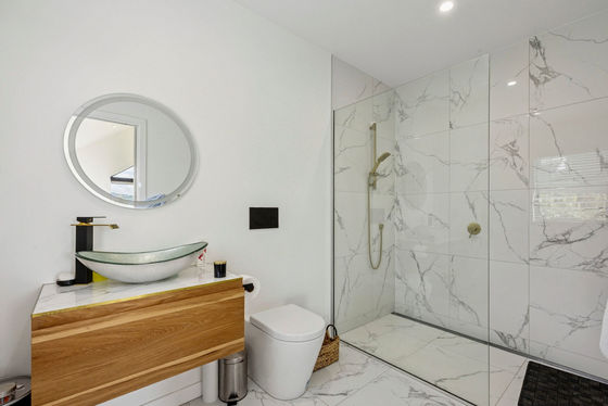 Upstairs ,or if you prefer - accessed via the lift, three bedrooms are positioned to capture light and outlook. The master suite is particularly striking, featuring a dramatic picture window, walk-in wardrobe and a heated tiled ensuite. The central family bathroom enjoys sea views and includes a beautifully appointed bathtub alongside a separate shower. Floor-to-ceiling windows, angled architectural detailing and thoughtfully layered lighting enhance the sense of scale and draw in natural light, while the home's north-west orientation ensures long afternoons and golden evening sun.