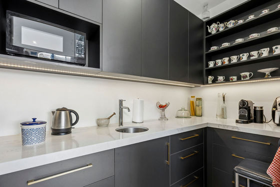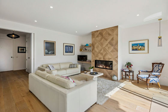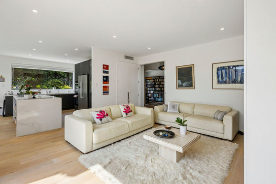 The entry level is dedicated to beautifully executed open-plan living, where oak flooring underfoot and a feature tiled gas fireplace anchor the space with warmth and texture. Large sliding doors connect seamlessly to an alfresco setting " a sunny, fenced courtyard framed by easy-care landscaping, designed for relaxed entertaining rather than weekend upkeep. The kitchen is both functional and visually impressive, appointed with stone benchtops, double ovens, gas cooking, brushed brass accents and a well-configured butler's pantry. A versatile room on this level, opening via cavity sliders, offers the option of a fourth bedroom or home office.