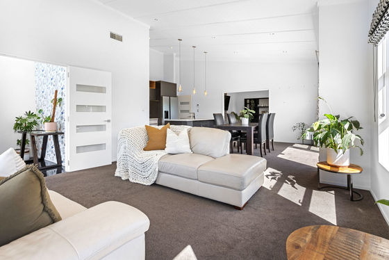 BEAUTIFUL: With modern family life in mind, this home showcases raked tongue-and-groove style ceilings that enhance light and volume throughout the open-plan living and dining areas. Seamless indoor/outdoor flow connects to the sun-soaked northwest patio, ideal for relaxed afternoons or effortless entertaining.