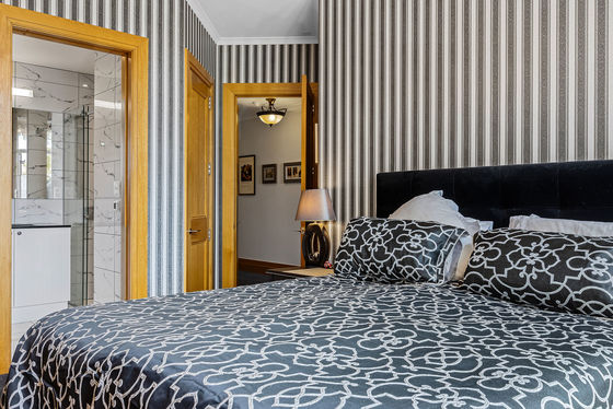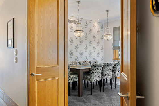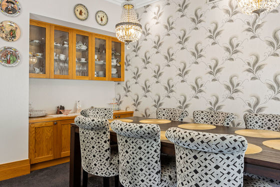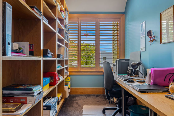 Further along the gallery hallway, a separate dining room and additional lounge provide warm inviting spaces for entertaining or retreat. Upstairs, three generous double bedrooms are supported by two bathrooms finished with polished glazed porcelain tiles, while a large fourth flexible room can function as a studio, workroom or additional bedroom. A dedicated office on this floor adds practical work from home capability.