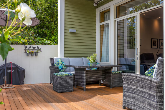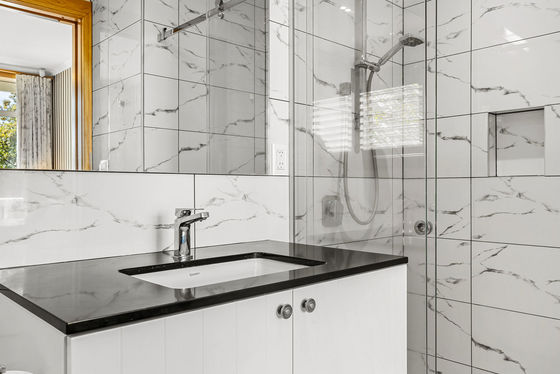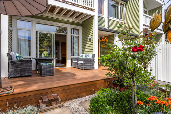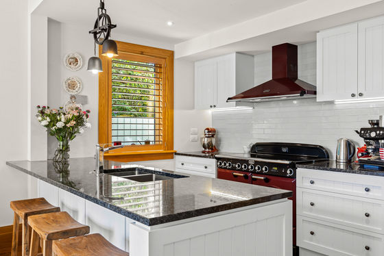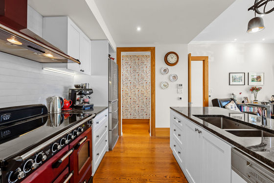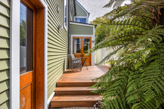 The front of the home centres around sun filled open plan living spaces where kitchen and day room connect seamlessly. The kitchen is appointed with Caesarstone benchtops, a walk-in pantry and an oversized Falcon induction range, while double doors extend living outdoors to a sheltered front deck and courtyard suited to morning coffee or relaxed entertaining. Inside, engineered timber flooring in Karelia Oak Ebony pairs with American White Oak joinery throughout, while high stud ceilings gently nod to the original heritage home that once stood here.