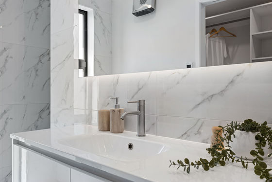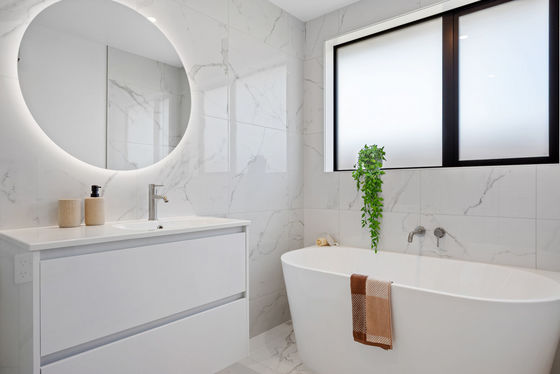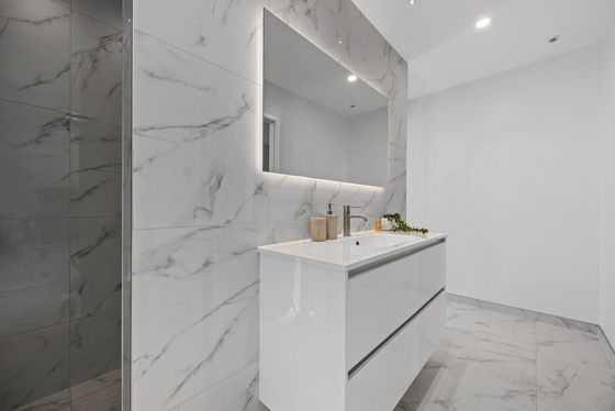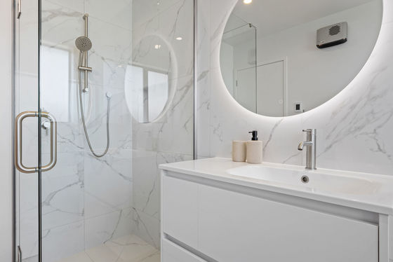Elegant bathroom and ensuite featuring designer tiles and under tile heating.