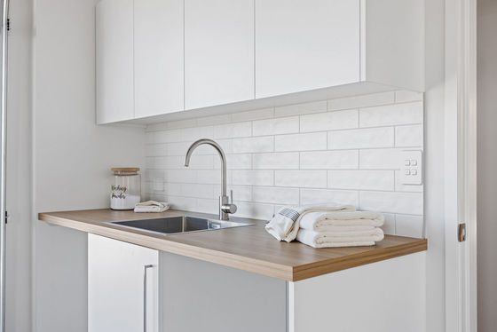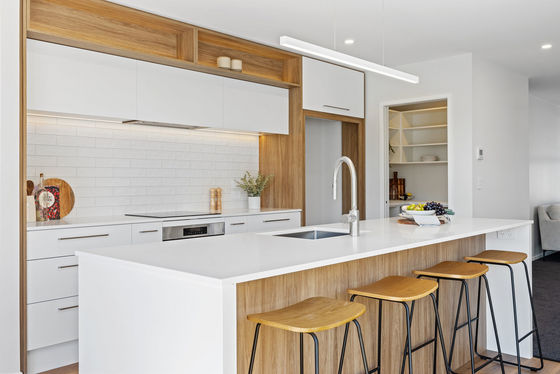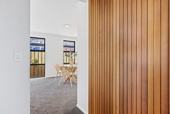Feature cedar timber wall and decking at the entry welcome you into a large open plan living area with modern trendy kitchen, Bosh appliances, stone bench top, walk in pantry and desk space.