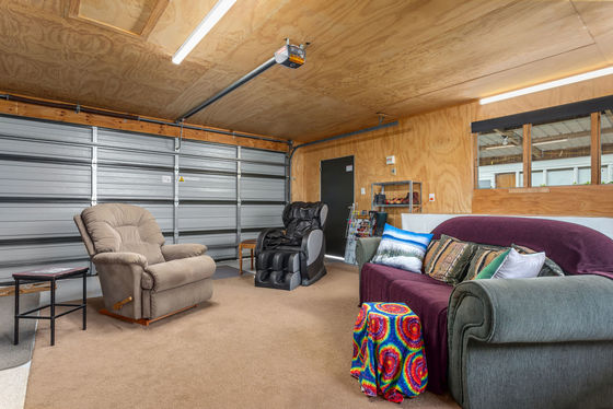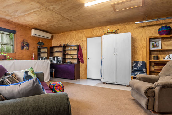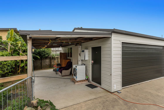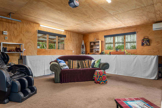 The property includes a fully code-compliant 12m x 7.2m garage which is only 12 years old. It features two heat pumps, lined internal walls, ceiling and wall insulation, and a side carport. Approximately half of the garage is divided into two rooms, one with a ranch slider, suitable for storage, hobby rooms, or additional accommodation.