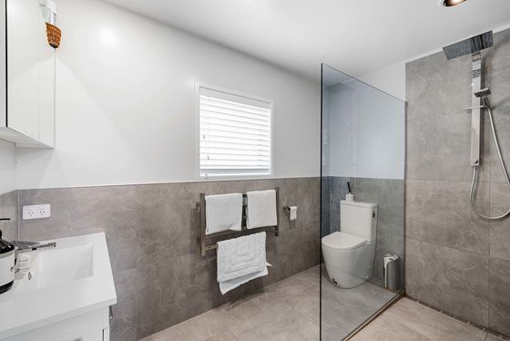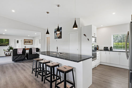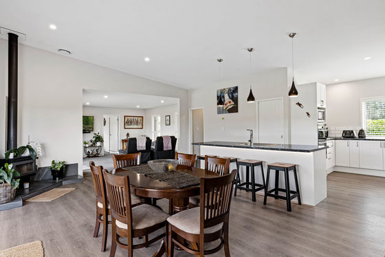 At the heart of the home, the open-plan kitchen, dining and living space feels warm, welcoming and beautifully connected to the outdoors. A woodfire provides cosy ambience through the cooler months, complemented by a heat pump and a heat transfer system. Double glazing throughout adds another layer of comfort and efficiency year-round.