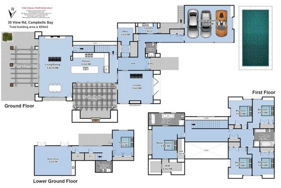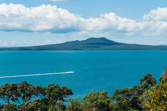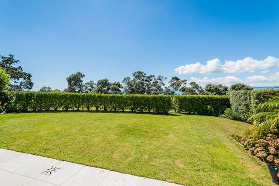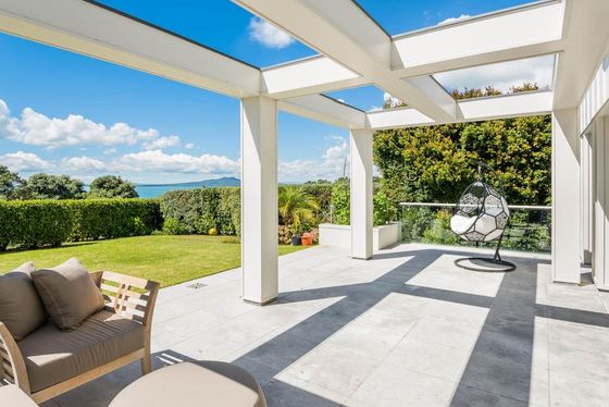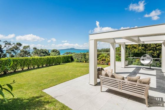 The main family and dining area spans the width of the home, flowing to a sun-soaked terrace and generous flat lawn, perfectly positioned to capture sea views stretching across to Rangitoto Island. A large office, guest powder room, separate laundry and internal-access triple garaging complete this level.