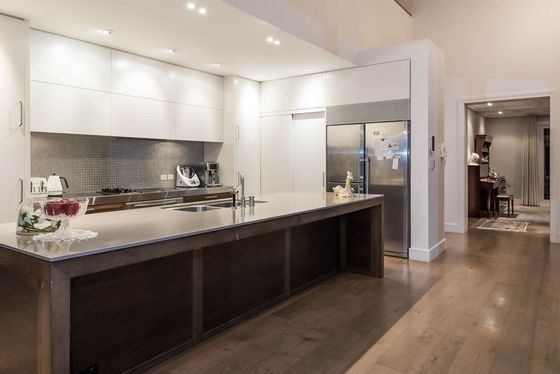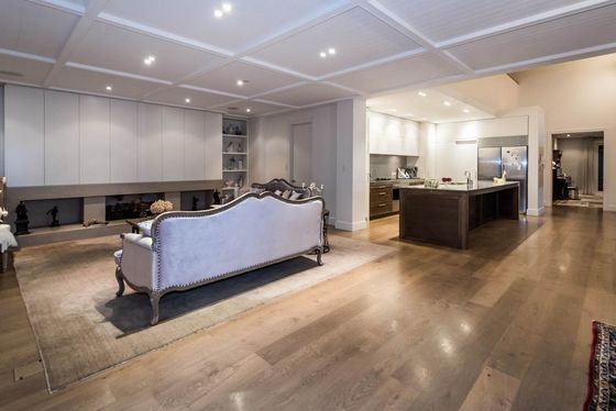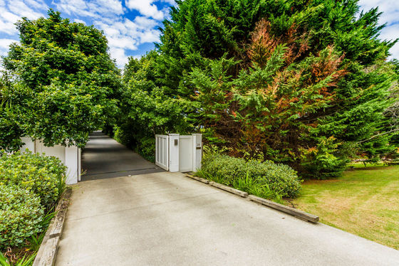 Secure gates and a tree-lined driveway create a strong sense of arrival. Double doors open to a generous foyer and formal living room with a gas fireplace and timber ceiling detailing, separated by feature cavity sliders. Beyond, the home opens to expansive open-plan living centred around a light-filled kitchen with a double-height void and skylights overhead. Appointed with Miele appliances, a Liebherr double fridge/freezer and a substantial island, this space connects seamlessly to a covered outdoor living area complete with a fireplace and heating for year-round use.