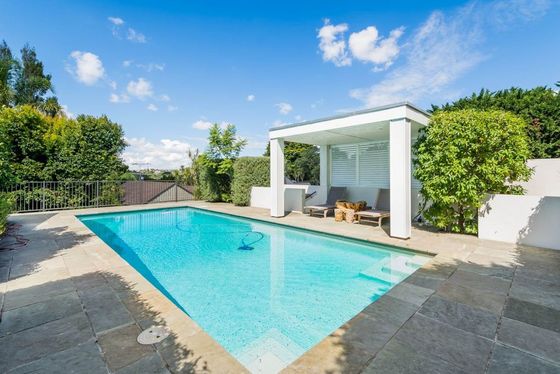 A swimming pool and cabana sit privately within beautifully landscaped grounds, completing a substantial coastal residence designed for relaxed family living and entertaining without compromise.