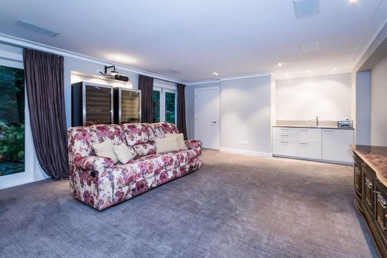 Upstairs, the master suite offers a spacious ensuite, bath, dual walk-in wardrobes and elevated outlook. Four further double bedrooms share a well-appointed family bathroom. The lower level provides excellent flexibility with a sixth bedroom, bathroom, games/media room with kitchenette, two full-height wine fridges and a substantial temperature-controlled wine cellar. Underfloor gas heating services key areas for comfort.