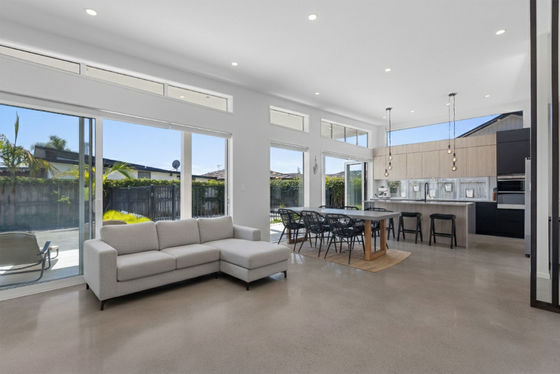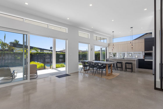 Designed for modern living, the spacious open-plan kitchen, dining, and living area showcases polished concrete flooring and striking high-pitched ceilings, creating a light-filled and inviting atmosphere. A second lounge opens onto private decking, providing an ideal retreat for relaxation or entertaining.