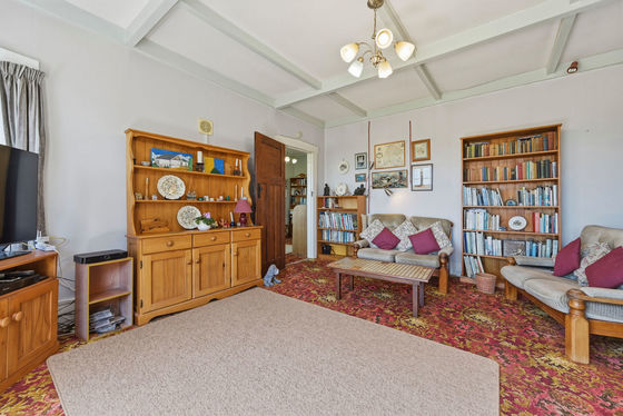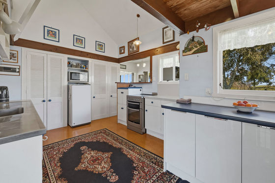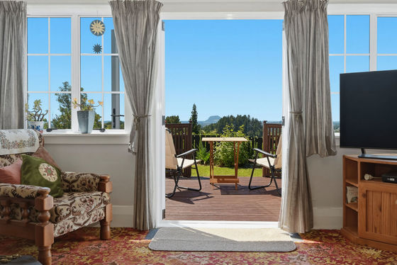 The spacious dining room makes the most of the lovely outlook, while the cosy north-facing lounge enjoys the benefit of a wood burner and heat pump. French doors open to the sun-bathed front deck.