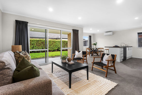 The open-plan kitchen, dining and living areas connect seamlessly, so everyone can spread out, allowing a calm, relaxing feel. A heat pump ensures year-round comfort through both Christchurch summers and winters.