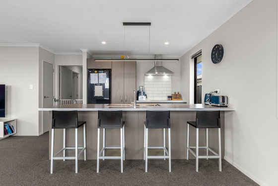 At the heart of the home, the sleek contemporary kitchen is well-appointed with modern appliances and generous storage, connecting effortlessly to the dining and living spaces to create a warm and inviting hub for everyday living or hosting friends.