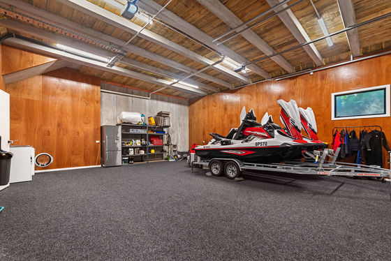 Huge garaging is a feature here. With an extra high stud there is ample space for boats, jet skis, or even a Campervan. Off street parking in front has room for at least two more vehicles. Inside the garage there is a third bathroom, ideal after boating or fishing. Three separate decks provide outdoor living on three different levels for sun and shelter at all times of the day and evening. One tucked behind the house has a barbeque and a spa pool. Views from up here are green and peaceful.