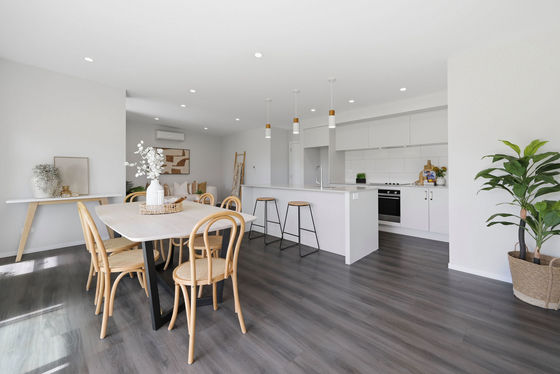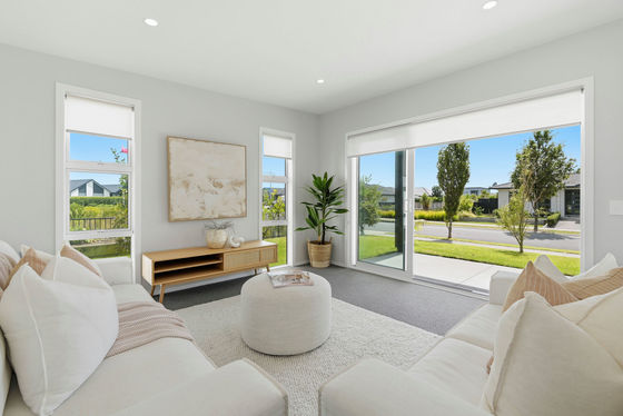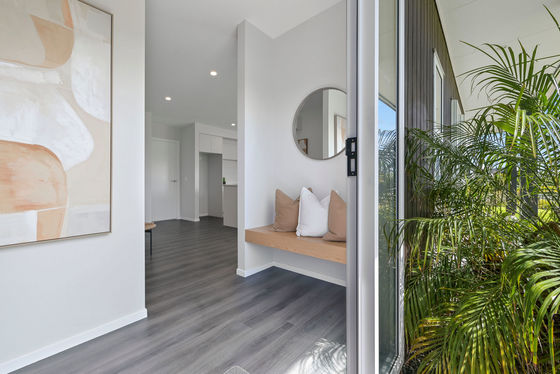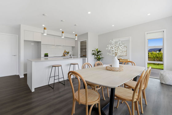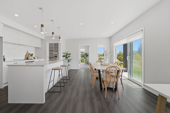 Designed with modern life in mind, the spacious open-plan heart of the home brings together the kitchen, dining and family living in one light-filled space. The high-stud ceiling and impressive triple-stacker ranch slider create fantastic indoor-outdoor flow and a bright, airy feel throughout the day.