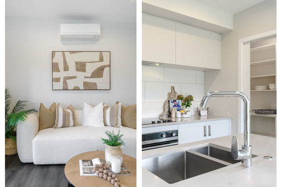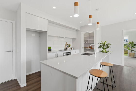 The kitchen is both elegant and practical, featuring well-proportioned stone benchtops for food-prep and serving, plus a generous walk-in pantry with abundant shelving and its own cavity slider to keep everything neatly out of sight.