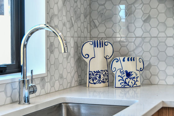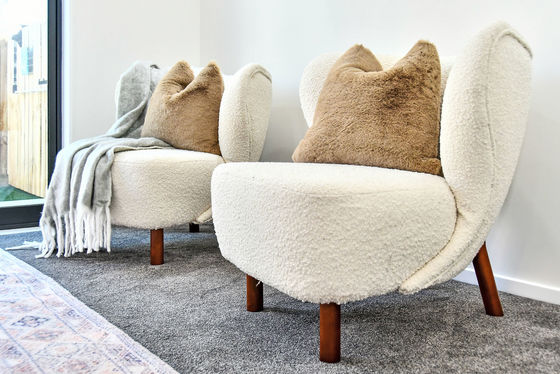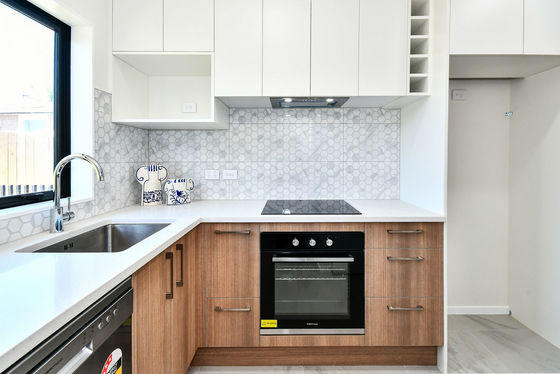 As you walk up the cobblestone path towards the home and step through the front door you are met with a modern kitchen with trendy large floor tiles and decorative wall tiles. The benchtops are made of engineered stone. The soothing colour palette of the kitchen is repeated throughout the home. Appliances include stainless steel dishwasher, unobtrusive rangehood, modern cooktop and oven.