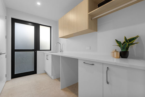 Inside, the home opens to light-filled living spaces designed for effortless everyday living and entertaining. At the centre sits a beautifully appointed kitchen, complete with a generous island, quality appliances and sleek cabinetry. It's a space that naturally draws people together, flowing seamlessly into the dining and living areas.