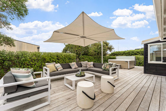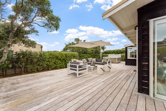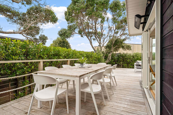 Inside, the layout works perfectly for family holidays. Two separate bedroom wings provide good separation, so parents can have their own space while kids or guests spread out comfortably in the other. Also suitable for 2 family living because of the flexible space options. The open-plan living, dining and kitchen flows naturally to generous decking that catches the coastal light and breeze - ideal for al fresco dinners with friends or a relaxed coffee after a morning beach stroll.