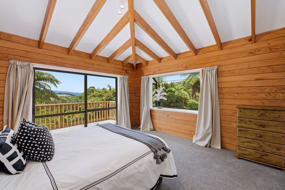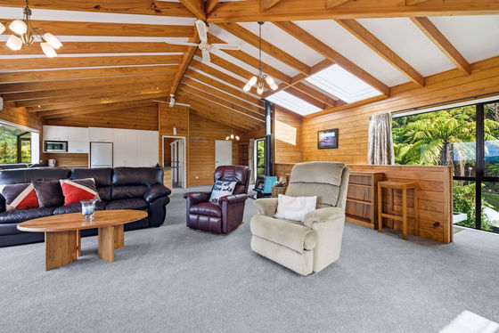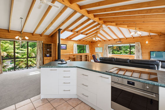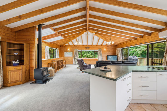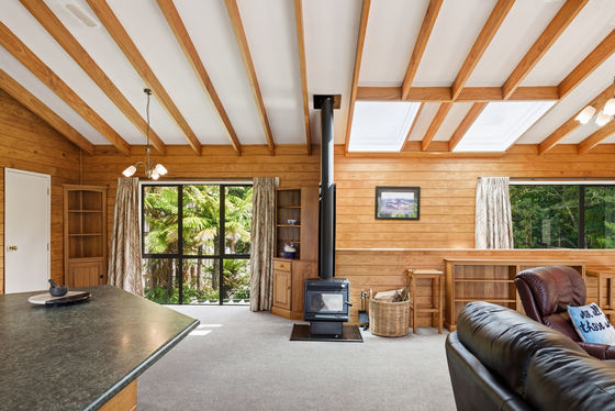 The home celebrates its location with raked timber ceilings and a full length deck that extends the living outdoors. Large windows draw in natural light, where comfort is assured with plush carpet, a wood burner, and two heat pumps.