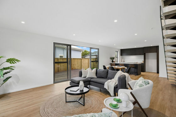 The main living area sits on the lower level and is open and light-filled, with the deck extending naturally from here - an easy place to gather with friends, or just relax and spend time in the afternoon sun. The kitchen has been designed with both function and conversation in mind, with a butler's pantry and a generous breakfast bar suited to food preparation or casual connection. Neutral interior tones create a calm backdrop for your own style, while the staircase creates a striking focal point.