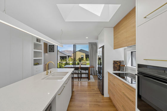 Positioned within the sought-after Wooing Tree Estate, this striking pavilion-style home sits proudly on a flat 317 sq m (more or less) greenway site; a "borrowed backyard." The thoroughly considered floor plan engages with and enjoys this amenity and the impressive views of the surrounding Central Otago mountain ranges, whilst also offering layered privacy to the interior.