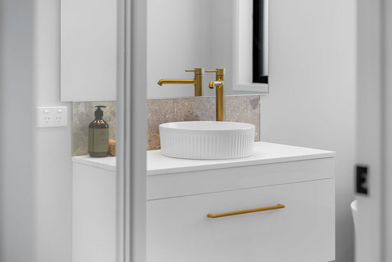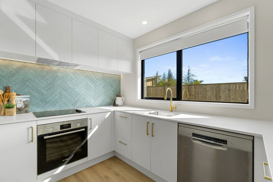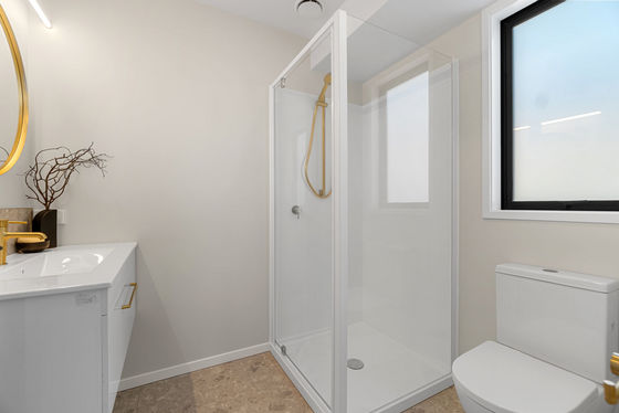 Offering three well-proportioned bedrooms, the home provides flexibility for a range of lifestyles. The master includes its own ensuite, while a separate toilet and main bathroom add everyday convenience. Bathrooms are finished with tiled floors and elegant gold tapware, giving a subtle sense of luxury.