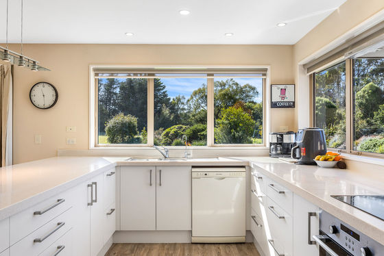 A U-shaped kitchen with a walk-in pantry and open views across the land sets the course for the open-plan living zone, where a dining area, lounge, study zone, twin window seats and a log burner build comfort and capability into the layout.