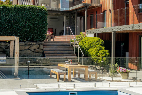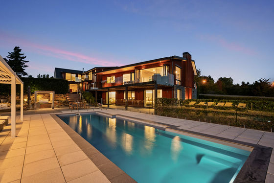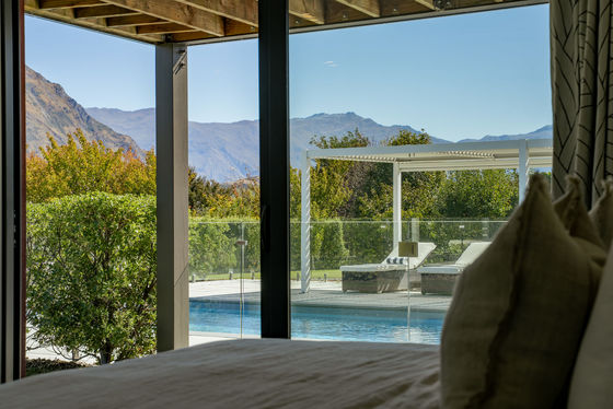 At its heart, the elevated living, dining and kitchen zone enjoys uninterrupted views across the pool to the lake and mountains beyond. A striking floor-to-ceiling fireplace anchors the space, while expansive stacking doors open seamlessly to the deck. The modern kitchen, complete with a generous scullery, is designed for both everyday living and entertaining at scale.