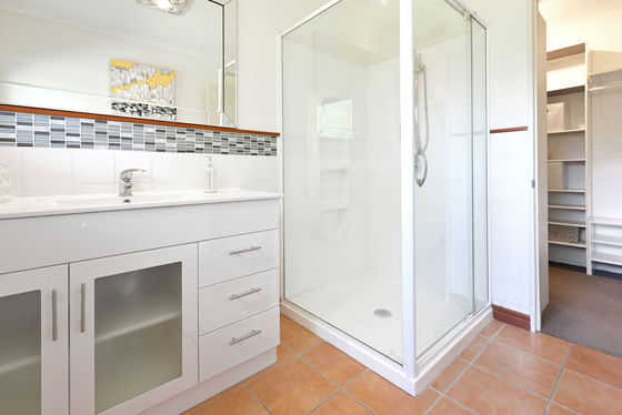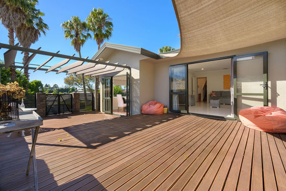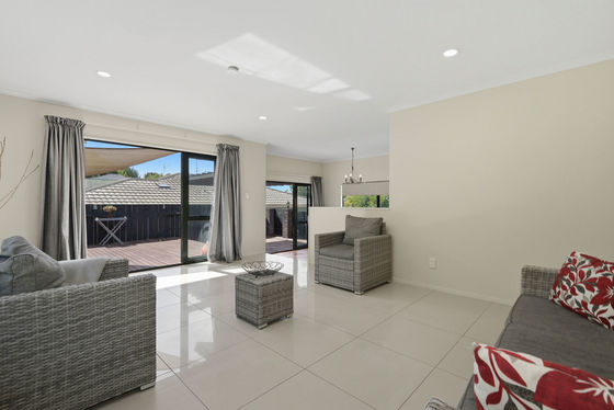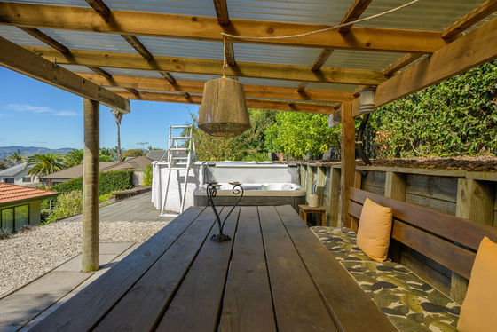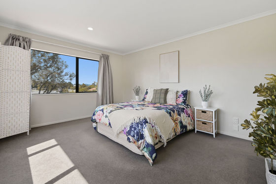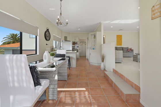 The home offers three well-proportioned bedrooms, including a master suite with views towards Mount Maunganui, complete with an ensuite and walk-in wardrobe. A generously sized family bathroom features a corner bath with a shower over it, and a separate laundry adds to the home's convenience.