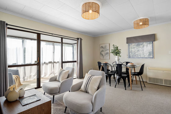 Open plan living and dining and floor mounted heatpump