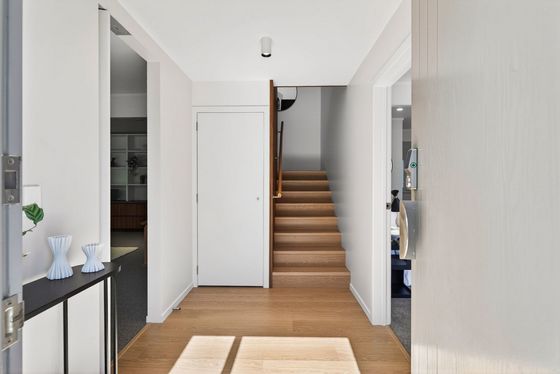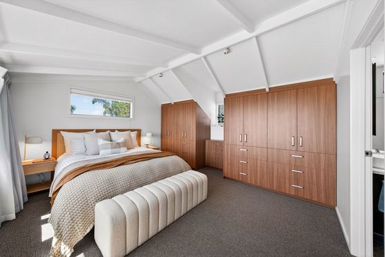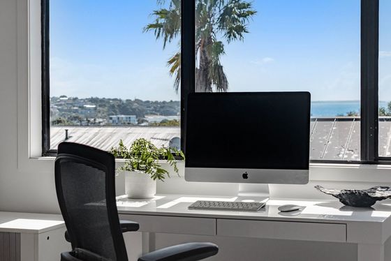 The upper level is dedicated to a generously proportioned master suite with its own ensuite, along with a large adjoining room currently used as an owner's lounge and office. From this level, the home enjoys surprisingly expansive sea views.
