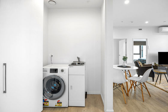 The open-plan living area benefits from abundant natural light, contributing to an inviting and expansive atmosphere. Both bedrooms are generously sized, and the bathroom presents a contemporary design. The kitchen is equipped with premium appliances, a stone countertop and tiled splash back completing this exceptional residence.