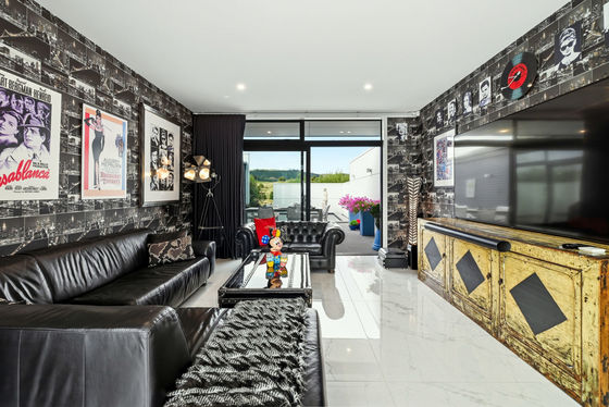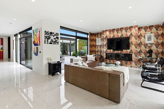 Material selection throughout the home reflects a commitment to quality, with tiled surfaces, underfloor heating, and a feature gas fireplace providing comfort through every season. A dedicated media room further enhances the home's versatility.