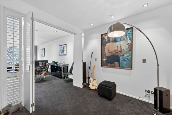 The master is positioned alongside the living area, opening directly onto a substantial deck which has been completely rebuilt. A walk-through wardrobe leads to a well-proportioned ensuite. The second bedroom, currently configured as an additional living or music room, offers flexibility and can easily accommodate a full bedroom setup if required. A dedicated office provides an ideal work-from-home solution. These spaces are complemented by a generous family bathroom with a spa bath and a separate powder room for guests.