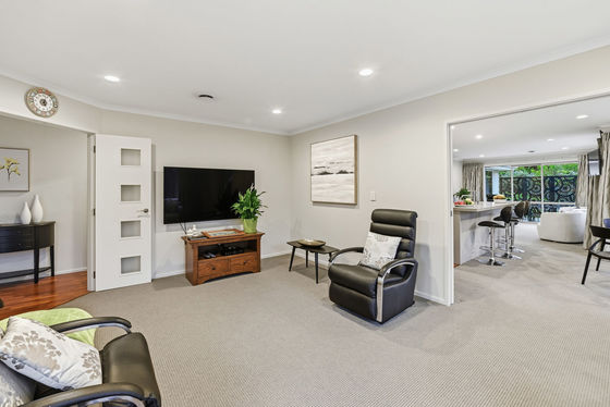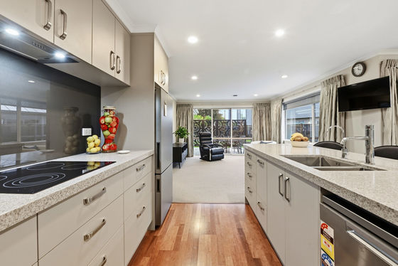The interior layout flows seamlessly from the formal lounge at the entrance through to the dining area and into the second living space. At the heart of the home, the designer kitchen is equipped with a double oven, ceramic cooktop and filtered water tap. It's perfect for everyday living and entertaining alike.