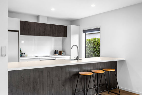 • Modern kitchen with electric hobs, under-bench oven, rangehood, dishwasher and plenty of bench space and cupboards