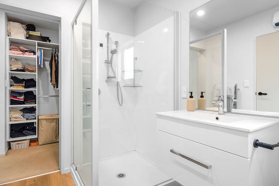 • The bathroom has a separate shower, bath, wall hung vanity with large wall mirror and toilet. Heated towel rail and 3-in-1 light, heat and extractor fan. There is access to the master bedroom as well. Laundry is allocated in cupboard off the hallway
