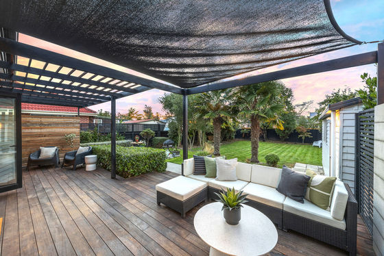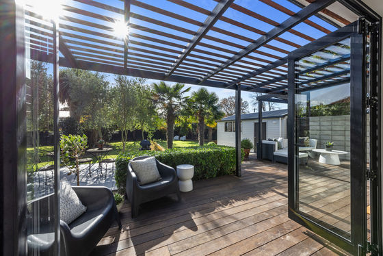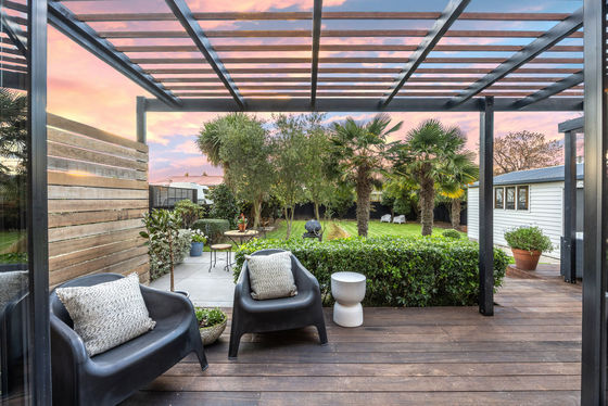 Both a bi-fold and French doors expand this space outdoors, where living is generously scaled. The pergola-topped deck and shade sail give room for entertaining and downtime. Step down to the paved patio and terraced lawn bordered by feature palms, olive trees as well as fruiting apple and feijoa trees and a grape vine all coming together to create atmosphere and extra depth to the outdoors.