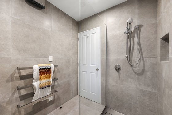 A fully tiled bathroom leads the upgrade, with statement subway tiling carrying that same clean-lined edge through to the kitchen.