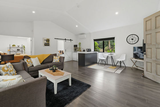 The main home has been designed with both scale and comfort uppermost. Double height doors, full length curtains, and an oversized scullery add a sense of ease, while covered outdoor living and wide wraparound decks invite you to spend time outside, surrounded by established gardens and fruit trees. The addition of a large pergola with curtain-sides extends outdoor dining to a year-round activity. A large crowd will be easily accommodated here, the current owners entertain a lot, and the home has been planned to absorb and welcome a gathering. Be warned though, your guests may never leave!