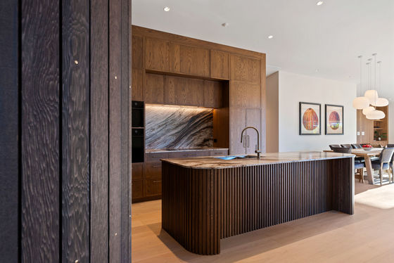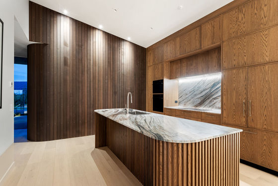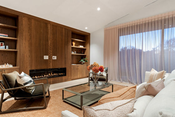 Inside, the kitchen is a showpiece - book-matched spectacular natural stone benchtops and splashback, full-height oak cabinetry, and joinery that belongs in a design magazine. The lounge anchors around a gas fire set into a wall of oak with built-in shelving from floor to ceiling. Warm, considered, and built to last.