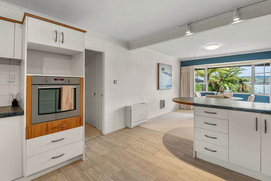 Inside, an open-plan kitchen and dining area takes in sparkling lake views, flowing through to a generous lounge warmed by a solid-fuel fire. The layout encourages easy movement between living spaces and the outdoors, where a sheltered courtyard and spacious lawn create a relaxed setting for entertaining or simply soaking in the serenity.