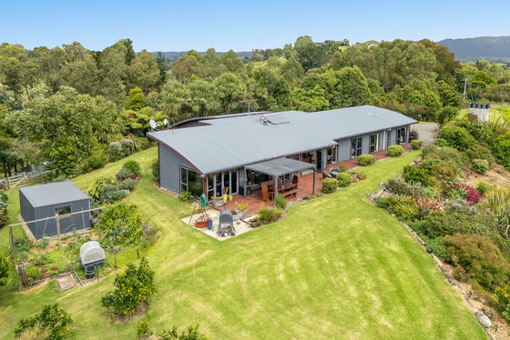 Presenting a spacious, contemporary four-bedroom residence situated on Turntable Hill Road, offering panoramic elevated views alongside a self-sufficient lifestyle, bonus of fireplace with wetback and solar hot water. The home features polished concrete aggregate flooring throughout, ample natural light, and bi-fold doors that open onto an expansive deck with a louvred pergola, providing an ideal setting for outdoor entertaining and barbecues.